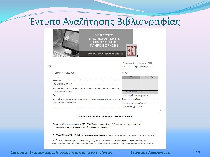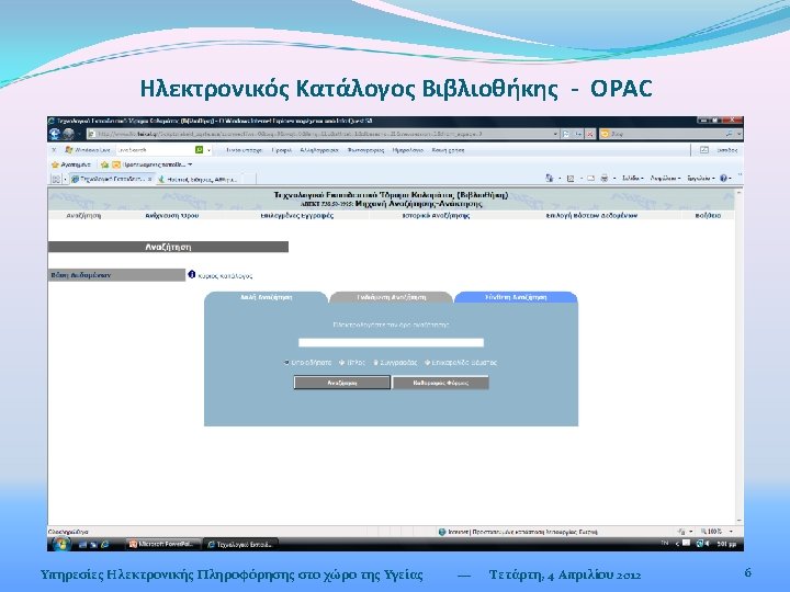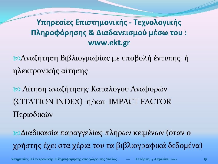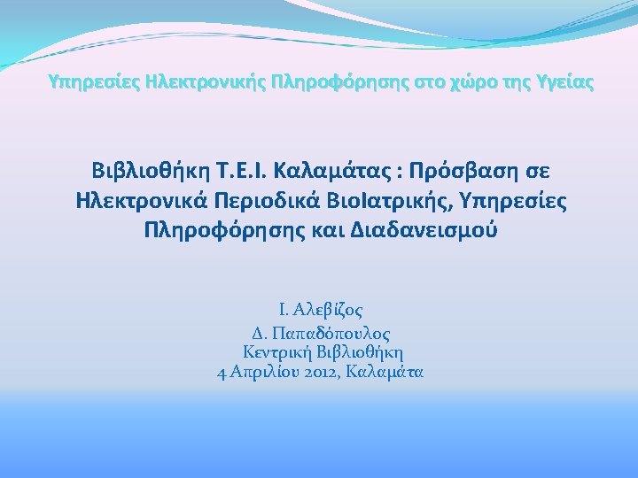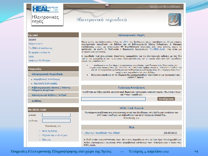 Πρόσβαση στα ηλεκτρονικά περιοδικά των εκδοτών / διαθετών: ALPSP (Association of Learned and Professional Society Publishers) ACM (Association of Computing Machinery) ACS (American Chemical Society) AIP (American Institute of Physics) American Psychological Association (Psyc. ARTICLES) Cambridge University Press Elsevier (Science. Direct) Emerald IEEE ü ü ü ü ü Institute of Physics (IOP) Kluwer Law International (KLI) Lippincott Williams & Wilkins (LWW) Oxford University Press Project MUSE Sage Springer. Link Taylor & Francis Wiley Inter. Science Wilson Πηγή : Επιτροπή Ηλεκτρονικών Πηγών Σ. Ε. Α. Β. Υπηρεσίες Ηλεκτρονικής Πληροφόρησης στο χώρο της Υγείας --- Τετάρτη, 4 Απριλίου 2012 13