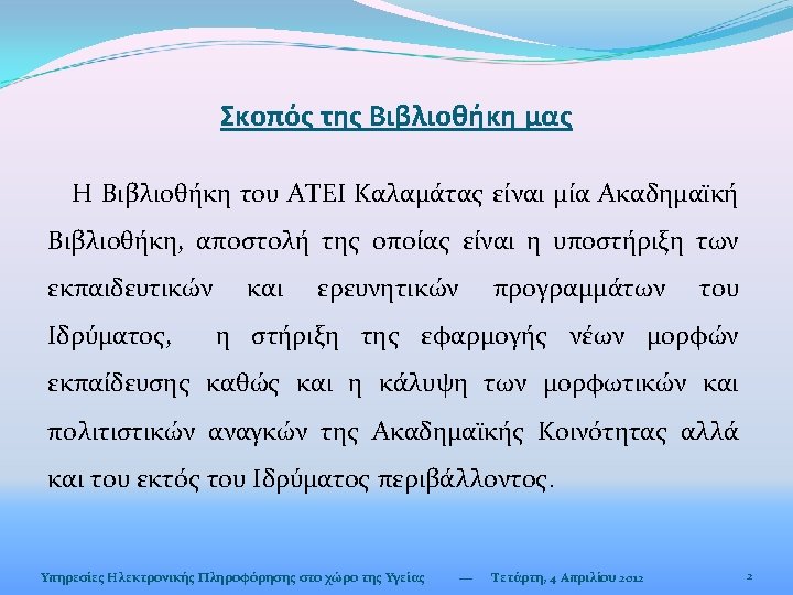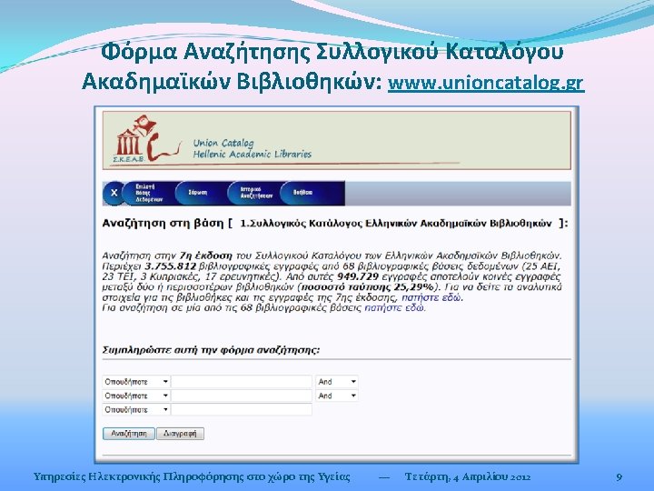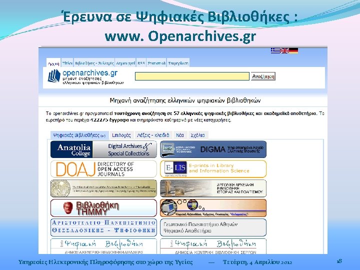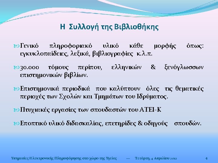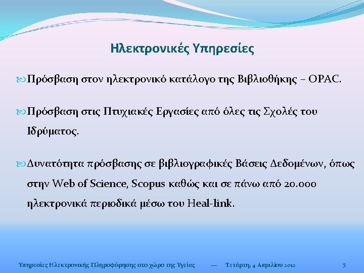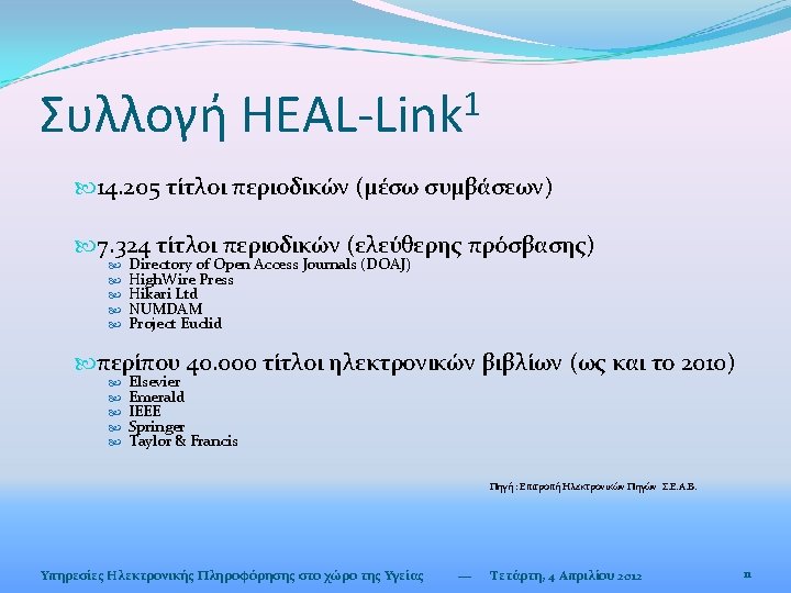 Συλλογή 2 HEAL-Link 6 βάσεις δεδομένων Art Index και Art Index Retrospective Art Museum Image Gallery Migne's Patrologiae Graecae OCLC First. Search Scopus Thesaurus Linguae Graecae 3 συλλογές γενικών και εδικών συλλογών Grove Art Grove Music Oxford Reference Online Πηγή : Επιτροπή Ηλεκτρονικών Πηγών Σ. Ε. Α. Β. Υπηρεσίες Ηλεκτρονικής Πληροφόρησης στο χώρο της Υγείας --- Τετάρτη, 4 Απριλίου 2012 12