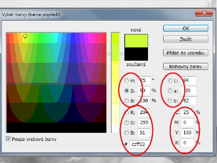 n Hodnota RGB se často udává v šestnáctkové soustavě (HEX hodnota), kdy sytost barvy je udána v rozmezí 00 - FF, tvar zápisu je rrggbb. Barva červená je např. ff 0000. ff - maximální možná hodnota červené 00 - žádná zelená 00 - žádná modrá Číselník barev