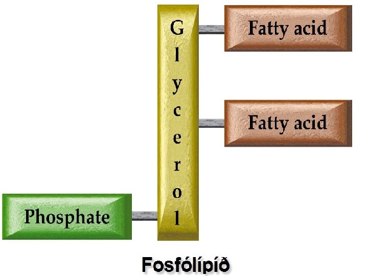 Fósfólípíð • Fosfólípíð er oft táknað sem höfuðfætla þ. e. hringur með tveimur endum úr. Þar sem hringurinn táknar fosfathópinn en endarnir/fæturnir tákna fitusýrurnar. • Fosfathópurinn er vatnssækinn (samlagast vatni). En endarnir eru vatnsfælnir. • Fosfólípíð eru aðaluppistaðan í frumuhimnunni, og er því mjög mikilvæg gerð fitu