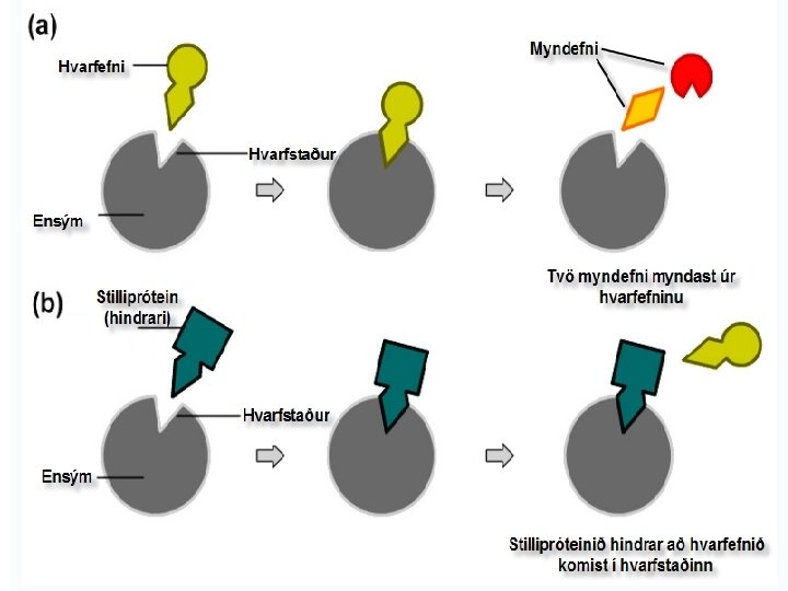 Ensím • Nokkur atriði um ensím – Ensím eru sértæk, þ. e. hvert þeirra hvetur bara fyrir einni gerð af efnahvarfi – Þau eru endurnýtanleg, þau eyðast ekki við efnahvarfið sem á sér stað – Þau eru viðkvæm fyrir breytingum á hita og sýrustigi, því það ummyndar próteinin (breytir lögun þeirra). Þetta kallast eðlissvipting. – Sérstök prótein, stilliprótein (modulators) geta haft mikil áhrif á virkni ensímsins með því að annaðhvort auka virkni þess eða hindra hana.