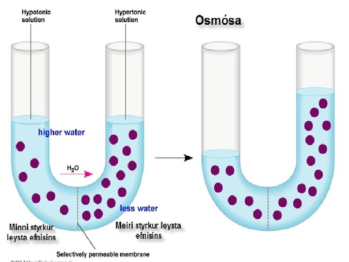 Osmósa • Osmósa er flæði vatns í gegnum valgegndræpa/hálfgegndræpa himnu (himna sem hleypir vatni í gegnum sig en ekki ögnum), frá lægri styrk efna að hærri styrk leystra efna. • Veldur þetta jöfnun á styrk leystu efnanna beggja megin valgegndræpu himnunnar. • Sá kraftur, eða þrýstingur, sem knýr vatnið í gegnum himnuna kallast osmótískur þrýstingur.