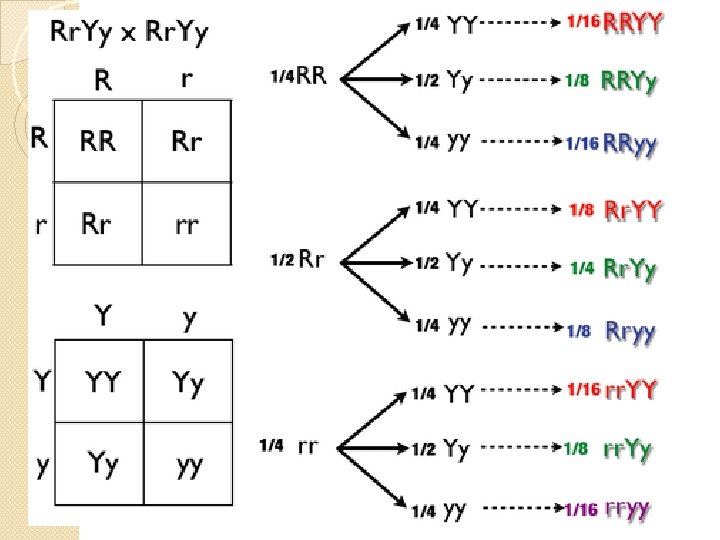 �Caso com 3 pares de alelos – semente verde, rugosa e flor branca (Vv, Rr, Bb) �Cruzamento – Vv. Rr. Bb X Vv. Rr. Bb �Gametas produzidos pelas plantas F 1 se combinam de 64 maneiras possíveis: � 8 tipos maternos X 8 tipos paternos, originando 8 tipos de fenótipos. �Probabilidade: 27: 9: 9: 9: 3: 3: 3: 1 = 64