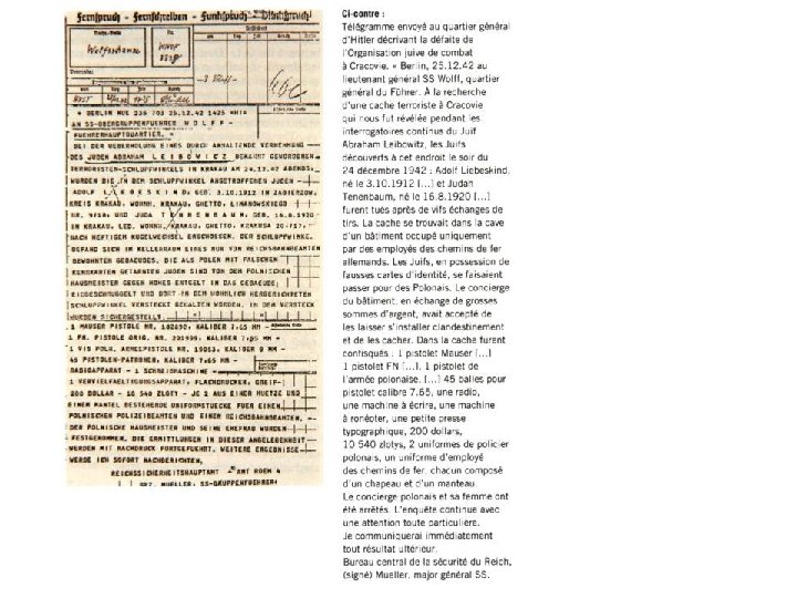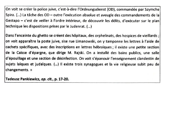 Concernant l’accueil de Juifs échappés. Rappel - conformément au paragraphe 3 du décret du 15 octobre 1941 sur les limitations de résidence du Gouvernement général (page 595 du code du Gouvernement général)les Juifs quittant le quartier juif sans permission encourent la Peine capitale. Conformément à ce décret, les personnes aidant ces Juifs à trouver un abri, de la nourriture ou leur vendant des biens de consommation seront également condamnées à la peine capitale. Il s’agit d’un avertissement catégorique aux populations non juives contre : 1/ l’offre d’un abri à un Juif, 2/ La fourniture d’aliments, 3/ La vente d’aliments. Dr Franke - Commandant - Częstochowa 9/24/42