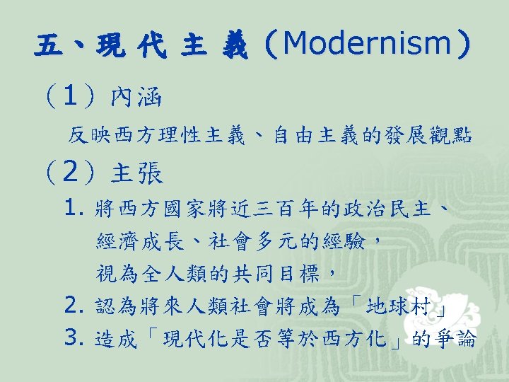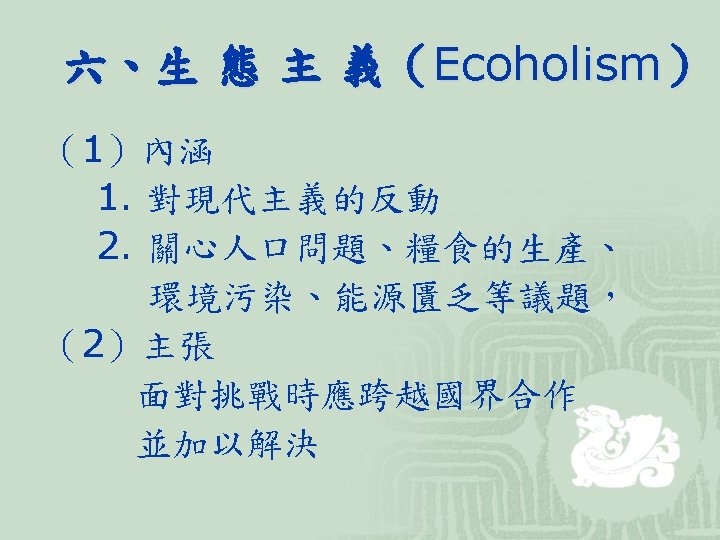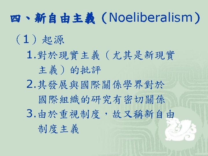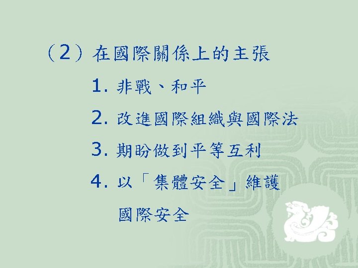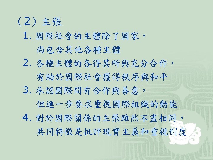 (3)代表學者 學者 著作及主張 Joseph S. Nye Robert O. Keohane David Mitrany 和Keohane合著 Power and Interdependence(1977) After Hegemony(1984) Neorealism and Its Critics(1986) 功能主義者 A Working Peace System 新功能主義者 Why We Still Need the UN (1986) Beyond the Nation-State (1964) Ernst Haas