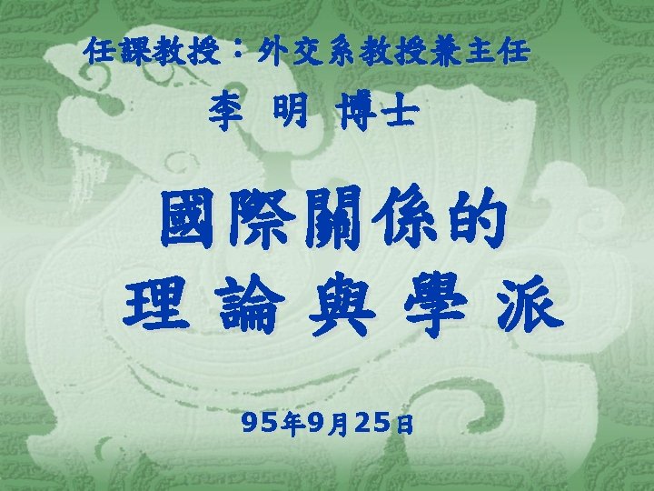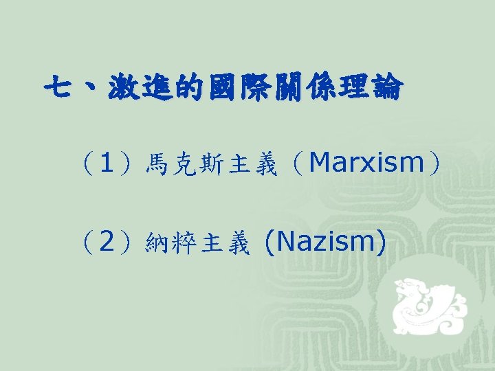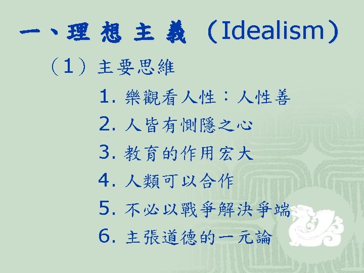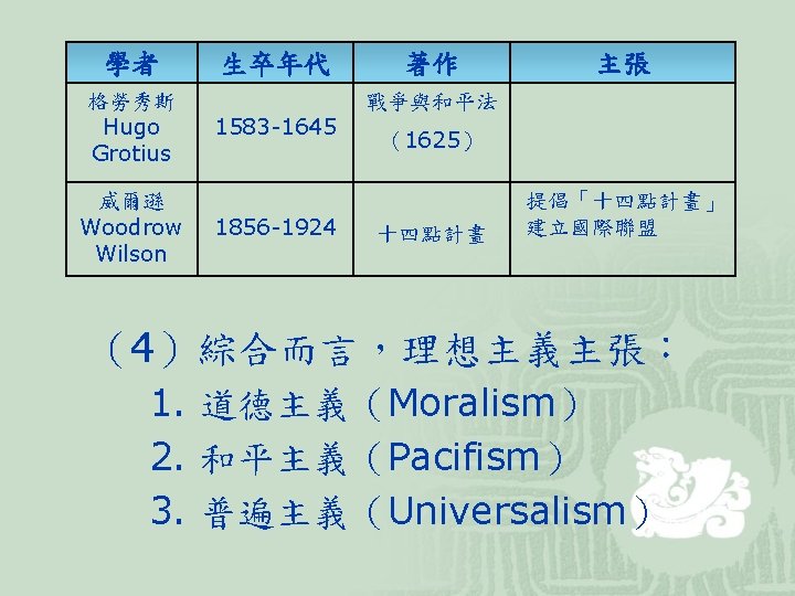(2)代表學者 學者 生卒 馬基維利 Niccolo Machiavelli 霍布斯 Thomas Hobbes 1469 ︱ 1527 1588 ∣ 1679 Reinhold Niebuhr 著作及主張 君王論 (或譯作「霸術」) 巨靈論 (Leviathan) Moral Man and Immoral Society 強調謹慎「Prudence」