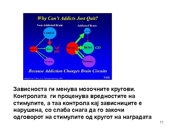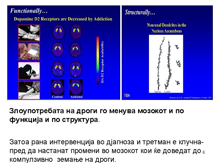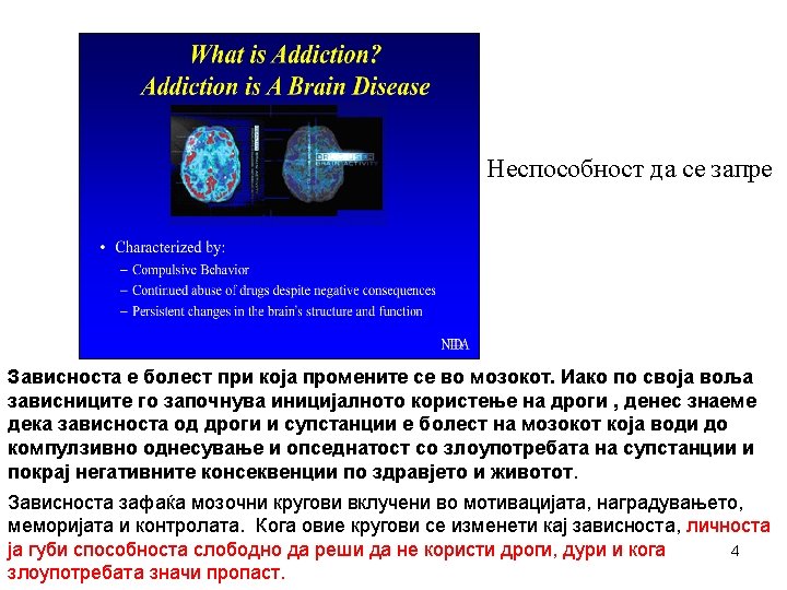 ZAVISNOSTA OD DROGA E BOLEST! Kontinuirana upotreba na droga pravi da liceto ne e pove}e sposobno da funkcionira normalno bez prisustvo na droga. Generalno e prifateno deka zavisnosta e hroni~na recidivira~ka (povtoruva~ka) sostojba- bolest. Taa ne e slabost na karakterot i voqata. 20