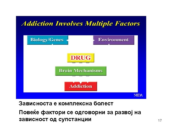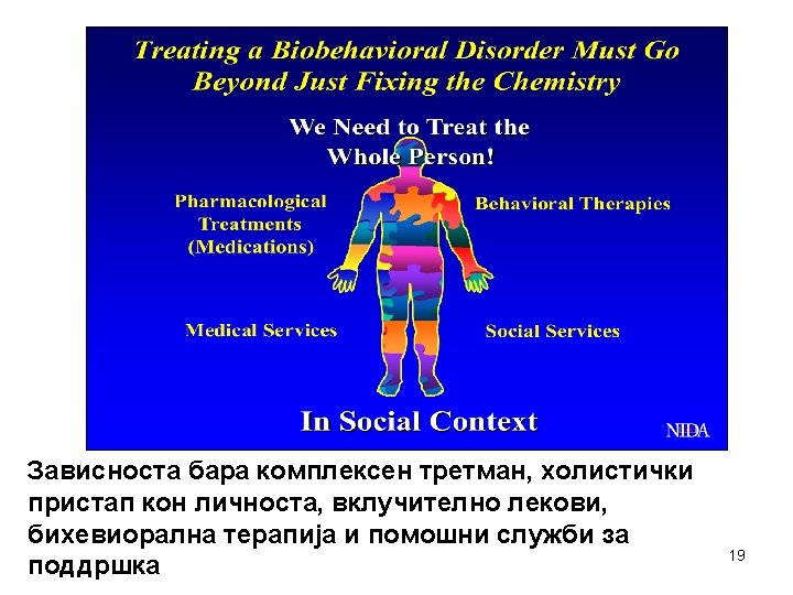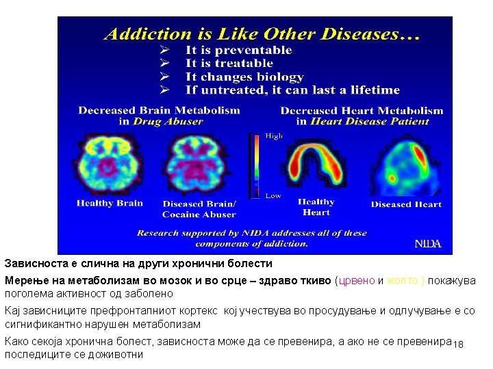 Zna~i mora da se prifati slednoto: Zavisnosta e hroni~na bolest kako sekoja druga. Pacientot zavisen od droga e pacient kako sekoj drug. Tretmanot na zavisnosta treba da se prifati i pravi isto kako i tretmanot na sekoja druga hroni~na bolest. 21