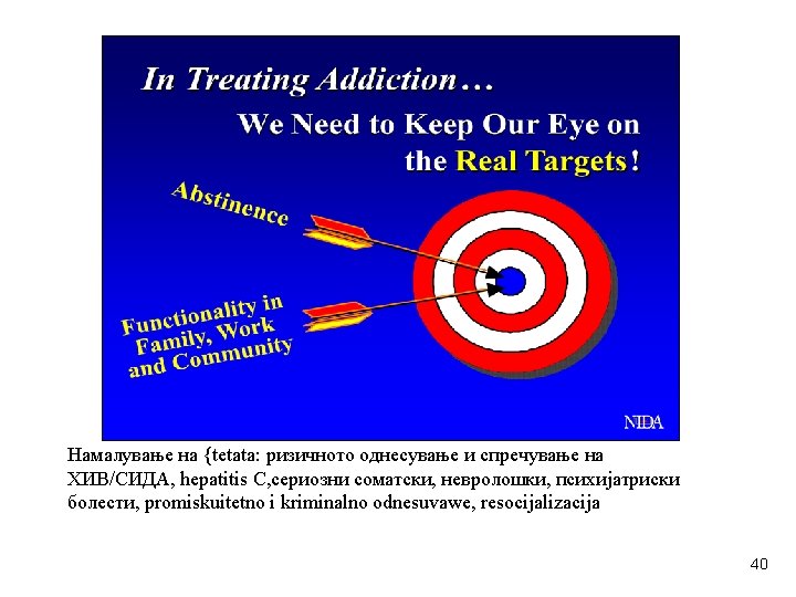 Celi na lekuvaweto Spre~uvawe na posledicite koi gi pravat nelekuvanite zavisnici kako na primer: Nelekuvani droga {irewe na droga zdravata pari zavisnici virusni infekcii populacija kriminal narkokriminalcite Licata koi upotrebuvaat droga se most pome|u zdravata populacija i narkokriminalcite, so nivno lekuvawe mo`e da se ote`ne prometot na mostot. Lekuvawe na zavisnicite 38
