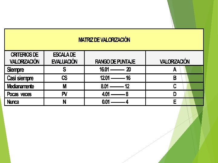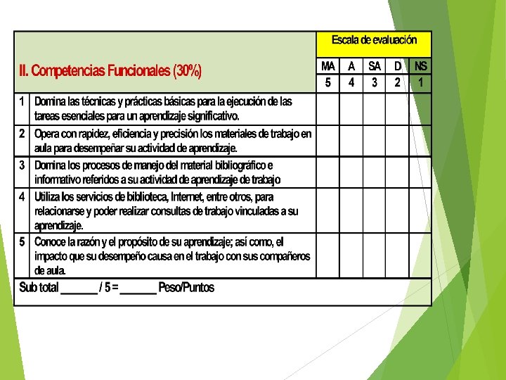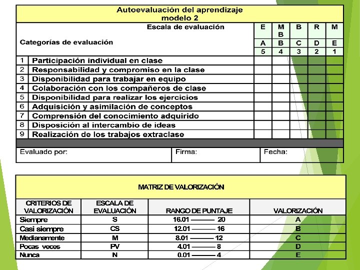 Otros ejemplos: Indicador Escala valorativa Siempre A veces Nunca Participar en actividades grupales Líderizar el grupo Indicador Escala valorativa Con mucha frecuencia Usos de signos de puntuación Con mediana frecuencia Con poca frecuencia Nunca