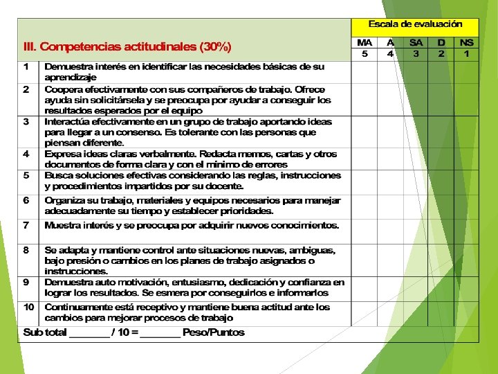 Es la descripción del grado en que el educando domina un indicador. ESCALA DE ESTIMACIÓN (ACTITUDES) Puede tener entre tres a cinco criterios valorativos La escala valorativa puede ser de dos tipos: Ø de frecuencias Ø de actitudes