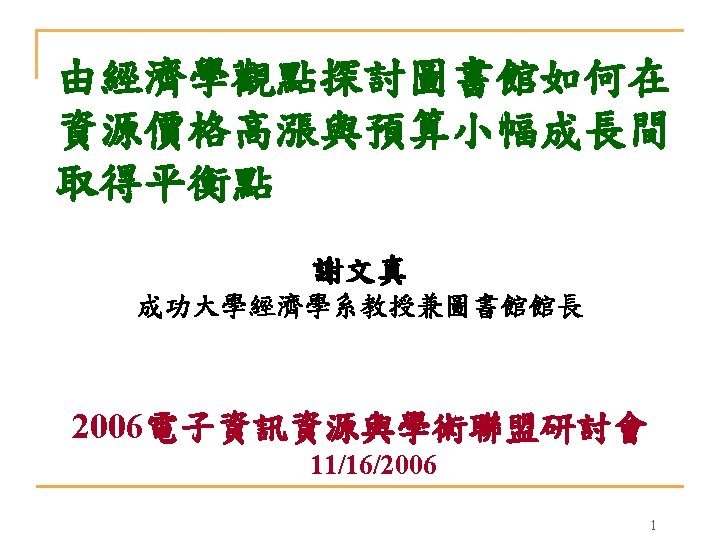 Table 1 美國國會圖書館 - 期刊成本的改變(續) AVG NO. AVG US$ AVG AVG OF US$ PER US$ PER TITLES TITLE TITLE AVG % OF CHANG E SUBJECT 2002 -06 2002 2003 2004 2005 2006 2002 -06 Philosophy & Religion 141 156 174 195 211 226 10 Physics 253 2178 2333 2538 2695 2850 7 Political Science 63 288 321 367 399 437 11 Psychology 160 358 388 437 471 516 10 Recreation 18 146 156 169 195 206 9 Sociology 314 332 365 412 452 491 11 Technology 181 1151 1241 1360 1464 1560 8 Zoology 135 973 1033 1091 1161 1259 7 Source:Library Journal, Periodicals Price Survey; Vol. 131, Issue 7 (Apr. 15, 2006). 12