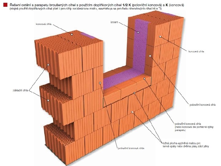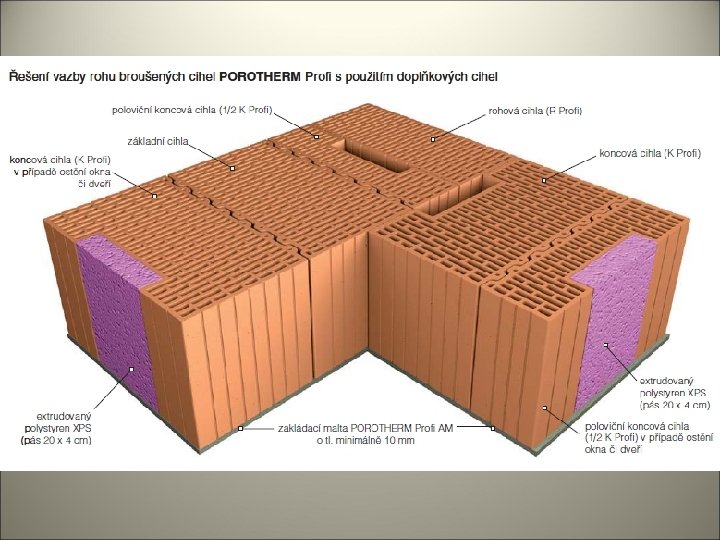 1. 1. CIHELNÉ TVAROVKY JSOU VETŠÍ NEŽ KLASICKÁ CIHLA PLNÁ A NA ROZDÍL OD CIHLY PLNÉ SE NEDĚLÍ NA ČÁSTI, JELIKOŽ SE VYRÁBÍ V RŮZNÝCH ROZMĚRECH, KTERÉ UMOŽŇUJÍ VAZBU BEZ DĚLENÍ TVAROVEK. PŘI ZDĚNÍ Z TVAROVEK MUSÍME DODRŽET ZÁSADU, ŽE DUTINY V TVAROVKÁCH MUSÍ BÝT DELŠÍ STRANOU KOLMO NA SMĚR TEPELNÉHO TOKU. DRUHY VAZEB: • VAZÁKOVÁ (POUŽITÍ U JEDNOVRSTVÉ ZDI, KDY SE TVAROVKY PŘEKRÝVAJÍ O 1/2 PŘES SEBE) • BĚHOUNOVÁ (PŘEVAZBY SE PROVÁDĚJÍ POUZE V ROZÍCH, PŘIPOJENÍ ZDI NENÍ ZAJIŠTĚNO PŘEVÁZÁNÍM, ALE POMOCÍ PÁSKOVÉ OCELI, KTERÁ SE PRŮBĚŽNĚ VKLÁDÁ DO LOŽNÉ SPÁRY. NEJZNÁMĚJŠÍMI CIHELNÝMI TVAROVKAMI JSOU VÝROBKY FIRMY WIENERBERGER, HELUZ … VAZBA ROHU Z TVAROVEK CD-INA