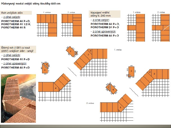 VAZBA ZDI TLOUŠŤKY 300 A 450 MM (1 - VAZÁKOVÁ VRSTVA, 2 -BĚHOUNOVÁ VAZBA) UKONČENÍ ZDI TLOUŠKY 450 MM POMOCÍ TŘÍČTVRTEČNÍCH CIHEL