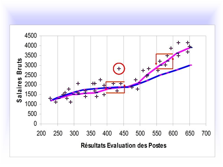 Ø Les syndicats ont graduellement obtenu des accords sur des grilles de classification, définissant des salaires minimums par secteur pour les différentes classes de salariés … • … fixé par une simple méthode d’évaluation des emplois allouant pour chaque emploi un nombre de points en lien avec la grille prédéfinie • … ou en utilisant un ensemble de facteurs pour peser l’importance relative de l’emploi de façon à faire le lien avec la grille du secteur (ex: 1975 grille de la métallurgie (UIMM)) : – La plupart des emplois permanents sont différenciés dans des classes hiérarchisées – Les emplois sont classés les uns par rapport aux autres, en fonction de facteurs tels que : niveau de connaissances requises, niveau d’autonomie, degré de responsabilité, complexité technique des tâches, capacité relationnelle requise, … – La rémunération de n’importe quel individu, dans une entreprise d’un secteur particulier, dépendra de celle fixée pour son emploi par la convention collective et le système d’évaluation
