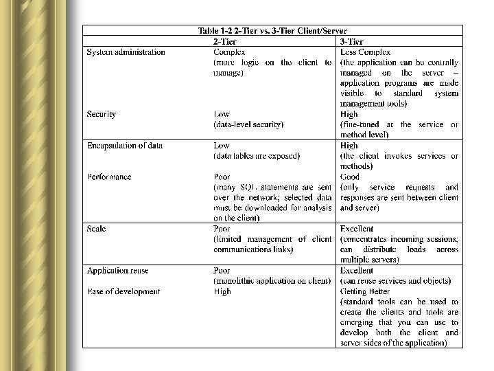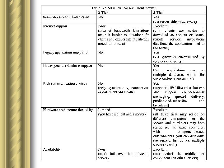 Benefits and Limitation of 2 -Tier Architecture l Benefits – great for creating applications quickly using visual builder tools thanks to its simplicity – appropriate to departmental applications • e. g. ) decision support, small-scale groupware, simple web-based applications l Limitations – not mission-critical, not scalable