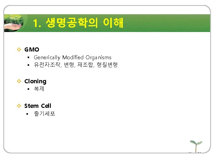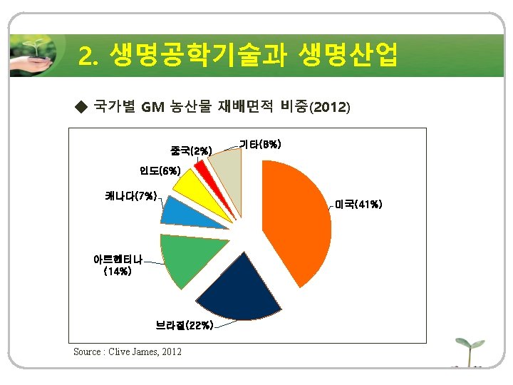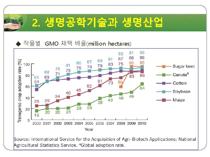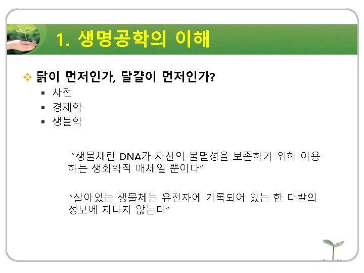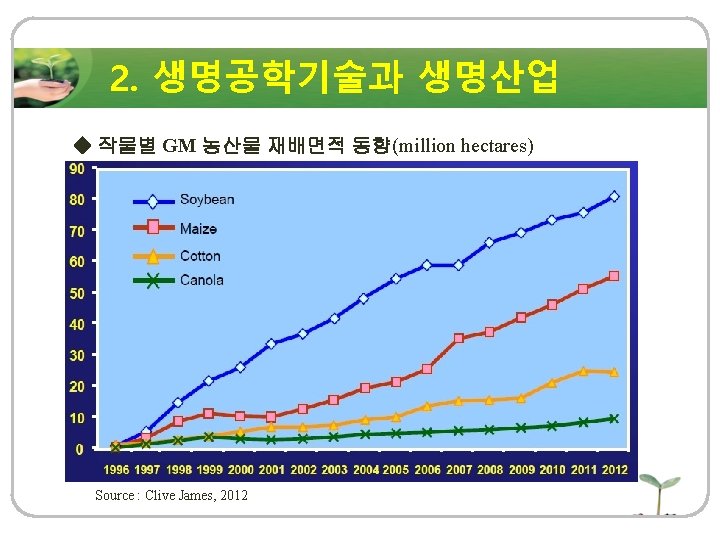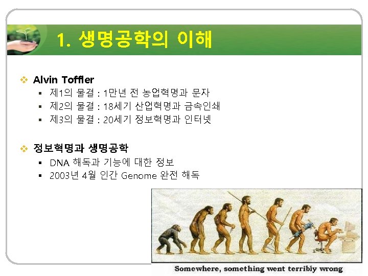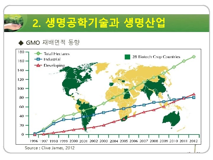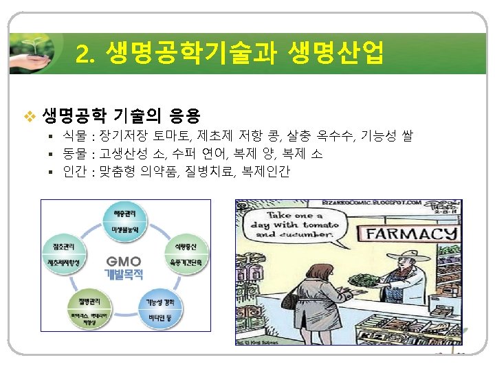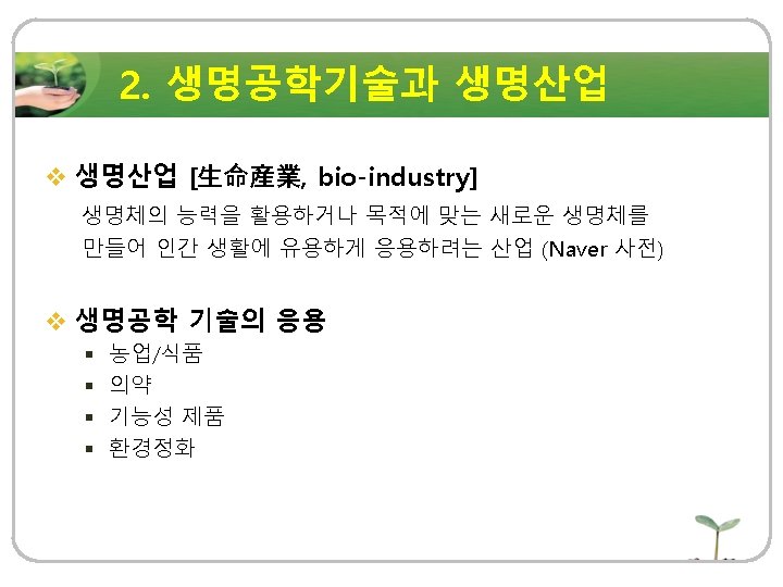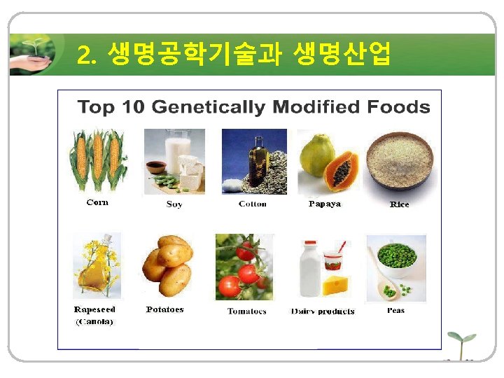 2. 생명공학기술과 생명산업 v 생명산업의 발전 신 제 품 Specialty Chemicals Pharmaceuticals Food processing Agronomic traits 1995 2000 2005 2010