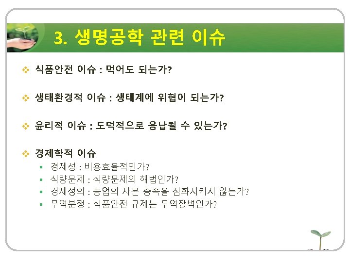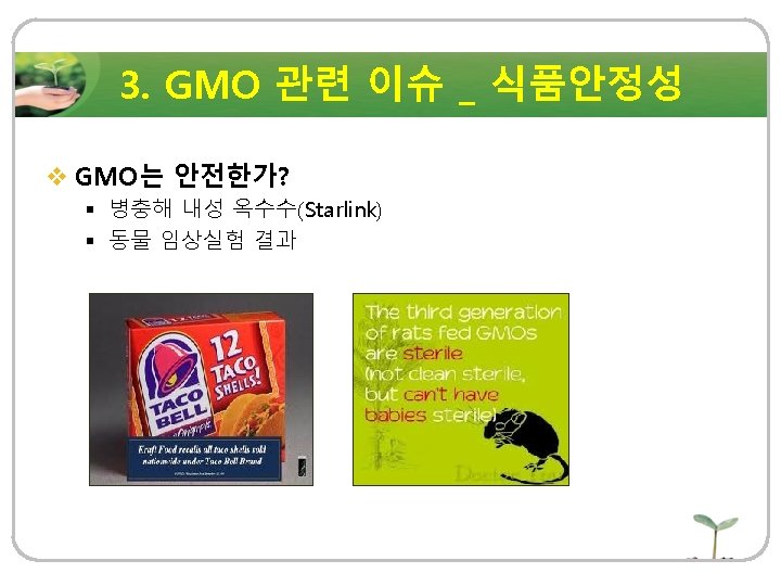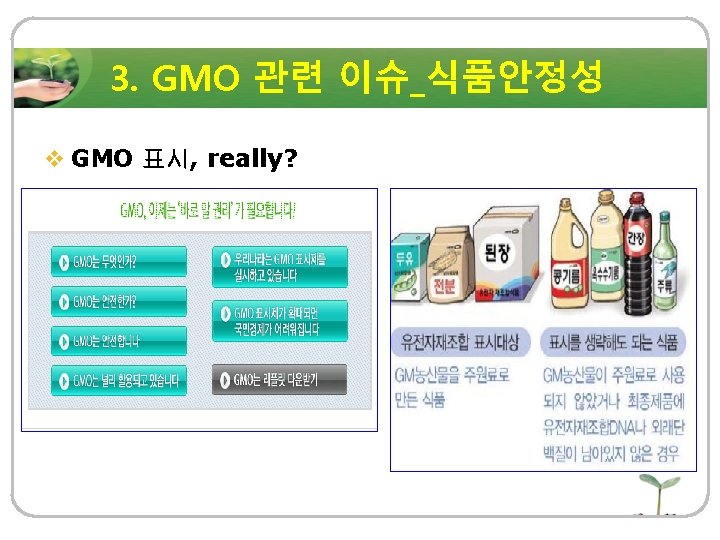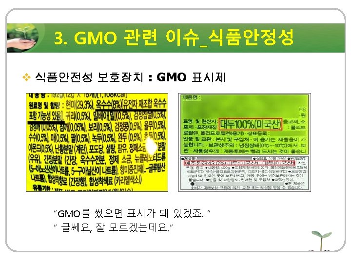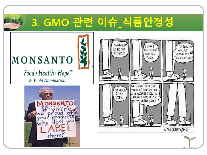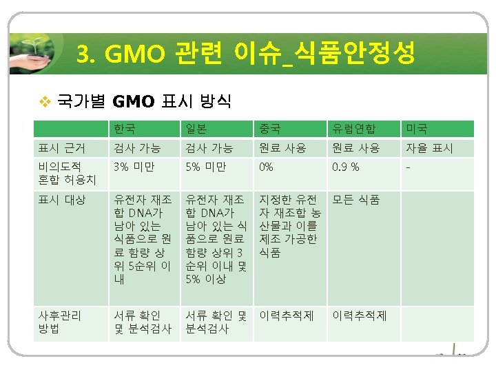 3. GMO 관련 이슈_식품안전성 v 식품안전 원칙 § 동질성 원칙(principle of substantial equivalence) § 사전예방 원칙(precautionary principle) GMO