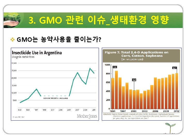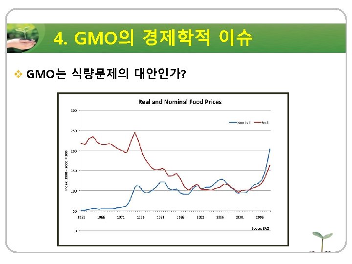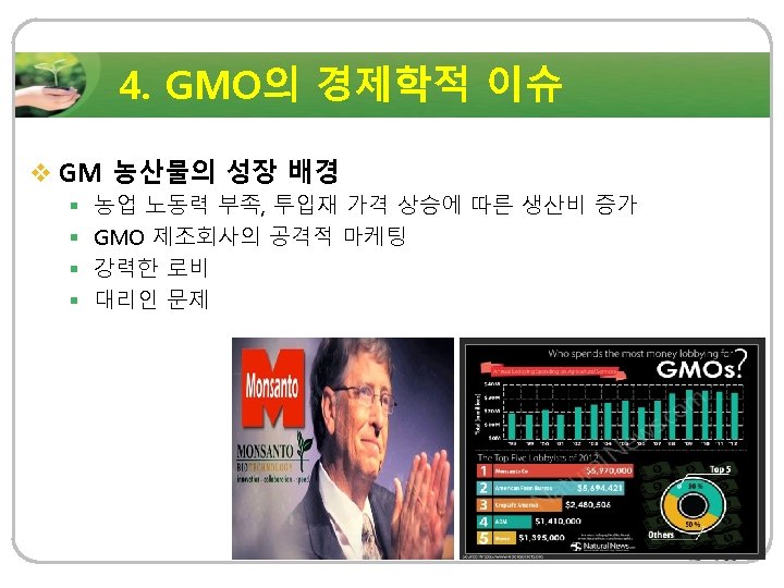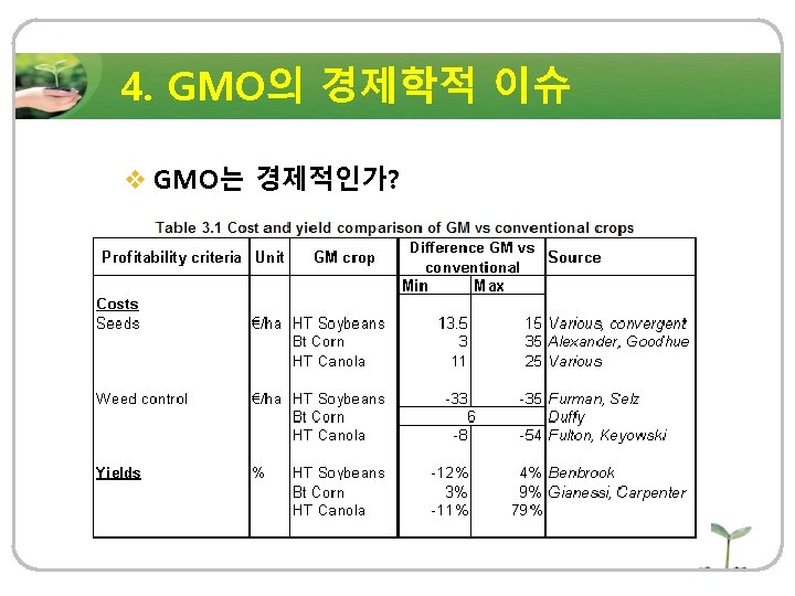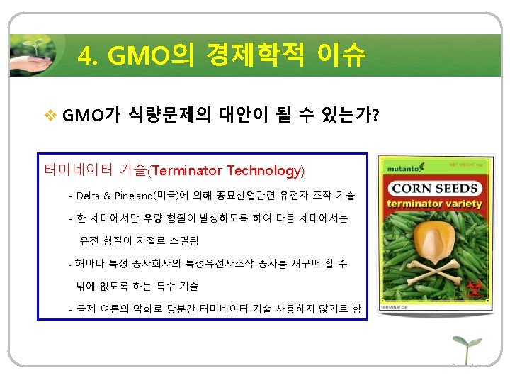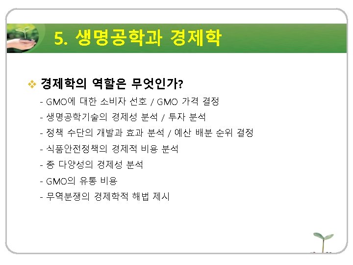 4. GMO의 경제학적 이슈 v GMO를 분리 유통시키는 IP COST Cents/bu 20 Elevator profit from segregation and IP (not observable) 15 Costs to elevator of “reshuffling” (cost of having less flexibility , Cost of having too few, too big elevators) 10 Testing costs = 2 cents/bu Farm profit from segregation and IP Costs of cleaning planter, combine = 0. 2 cents/bu 5 Extra costs of driving further to elevator, Waiting longer to deliver non-GM grain Extra costs from not using GM tech On farm (varies by farm) 22 cents/bu premium to exporter of non-GM soybeans to Japan (observable) 10 cents/bu premium to farm delivering non. GM soybeans to elevator near Illinois River (observable)