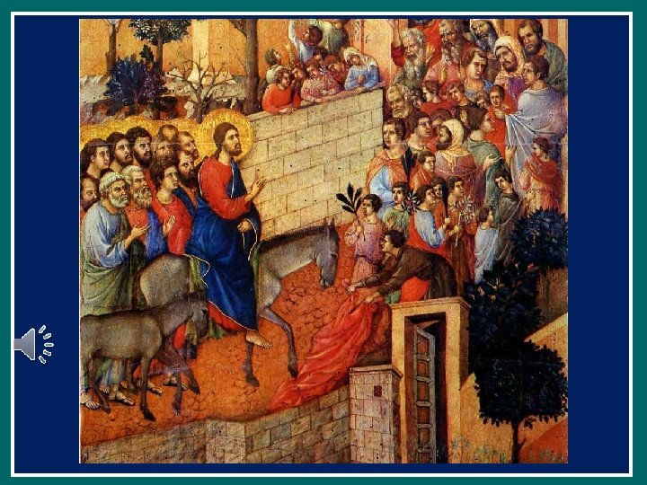 Gesù entra in Gerusalemme. La folla dei discepoli lo accompagna in festa, i mantelli sono stesi davanti a Lui, si parla di prodigi che ha compiuto, un grido di lode si leva: «Benedetto colui che viene, il re, nel nome del Signore. Pace in cielo e gloria nel più alto dei cieli»