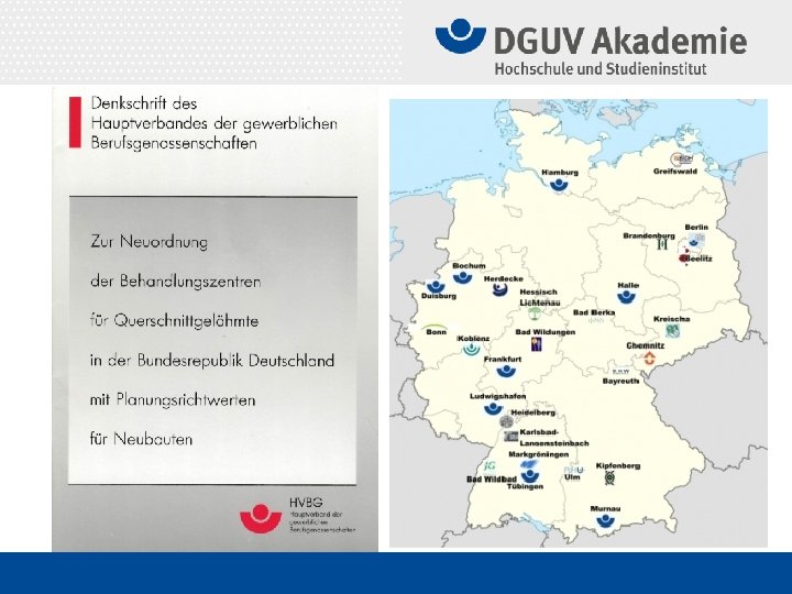 Standardisierung der (Schwer)Verletztenversorgung • Weißbuch Schwerverletztenversorgung (2. Auflage 2012) • Empfehlungen zur Struktur, Organisation, Ausstattung • sowie Förderung von Qualität und Sicherheit • Prävention – Intensivbehandlung - Rehabilitation • S 3 – Leitlinie zur Schwerverletztenversorgung 01. 07. 2011 • Präklinik – Schockraum – Erste OP-Phase • Verletzungsartenverfahren (VAV) der DGUV • Definition Klinikanforderungen / Verletzungsschwere • Trauma. Netzwerk DGU® • Koordination der strukturellen Patientenversorgung • Zertifizierung Lokale, (Über)Regionale Traumazentren • Trauma. Register DGU® • Begleitforschung - Qualitätssicherung