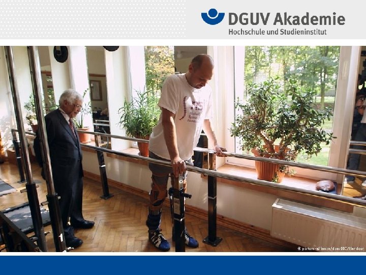 Derzeitiger Stand der Behandlung Querschnittgelähmter (bis 2014) • der Strukturschaden am Rückenmark ist weiterhin nicht heilbar, Behandlungsziel ist immer noch die Kompensation der hierdurch bedingten Funktionsausfälle • operative Behandlung der Wirbelsäulenverletzung mit weitestgehender Wiederherstellung von Form und Funktion • Weiterentwicklung der Hilfsmittel zur Dekubitusprophylaxe und der spezifische Therapien, insb. Operationen • Verbesserung der Mobilität und Aktivität der Betroffenen durch weiterentwickelte Hilfsmittel vom Spezialrollstuhl über das „Exoskelett“ bis zur EDV-gestützten Kommunikation und zu querschnittlähmungsspezifischen Sportgeräten und Sportarten • urologischerseits ist die Problematik des Nierenversagens, der Kontinenz und sogar der Fortpflanzung weitgehend beherrscht • Abwendung des Darmverschlusses durch „bowel program“