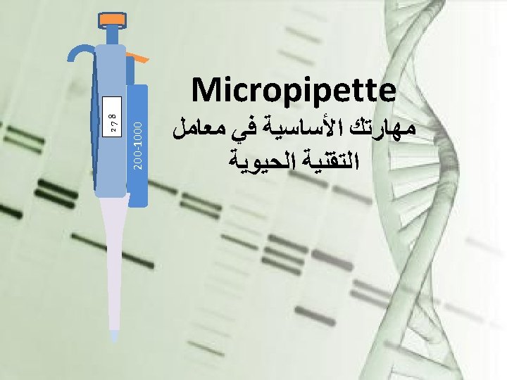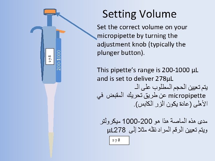 200 -1000 μL 278 This is a Micropipette it is used to accurately transfer small quantities of liquid. ﻳﺘﻢ ﺍﺳﺘﺨﺪﺍﻣﻬﺎ ﻟﻨﻘﻞ Micropipette ﻫﺬﻩ ﺍﻟـ . ﻛﻤﻴﺎﺕ ﺻﻐﻴﺮﺓ ﻣﻦ ﺍﻟﺴﺎﺋﻞ ﺑﺪﻗﺔ On this model the desired volume can be adjusted within the range of microliters (μL). ﻓﻲ ﻫﺬﺍ ﺍﻟﻤﻮﺩﻳﻞ ﻳﺘﻢ ﺿﺒﻂ ﺍﻟﺤﺠﻢ ﺍﻟﻤﻄﻠﻮﺏ . ( ﻣﻴﻜﺮﻭﻟﺘﺮ microliters ) ﺑﻮﺣﺪﺓ