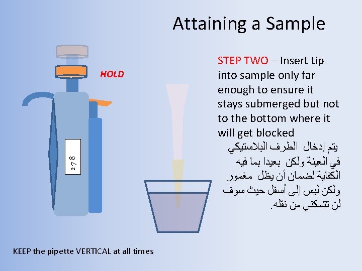 Attaining a Sample 278 HOLD STEP ONE – press plunger to first stop and hold. ﺍﺿﻐﻂ ﺍﻟﻤﻜﺒﺲ ﻟﻠﻤﺤﻄﺔ ﺍﻷﻮﻟﻰ ﻣﻊ . ﺍﻻﺳﺘﻤﺮﺍﺭ