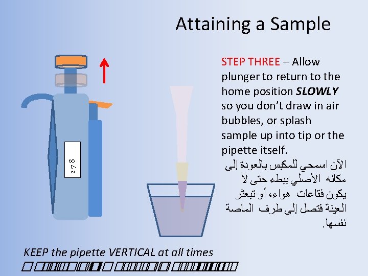 Delivering the Sample STEP SEVEN – Allow the plunger to return home. 278 ������� ��� �� ���� KEEP the pipette VERTICAL at all times