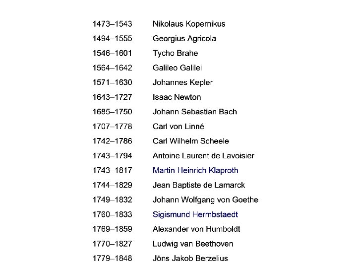 Klaproth als Analytiker • Zitat Berzelius: „Klaproth ist der größte analytische Chemiker Europas. “ • Erkannte als erster die Notwendigkeit, quantitativ wichtige Niederschläge vor dem Wägen bis zur Gewichtskonstanz bei bestimmten Temperaturen zu trocknen bzw. zu glühen (u. a. durch Nutzung der Brennöfen bei KPM). • Forderung nach reinsten Reagenzien. Peinliche Vermeidung von Fehlerquellen, z. B. Einfluss von Arbeitsgeräten (Tiegelmaterial). • Einführung des Brauches, nicht nur die Endergebnisse, sondern auch die Einzelgewichte der erhaltenen Niederschläge anzugeben. • Verbesserung des Silikataufschlusses durch Alkalischmelze im Silbertiegel. Zum Nachweis von Alkalien in Mineralien Einführung des Silikataufschlusses mit Bariumnitrat, später mit Bariumcarbonat. • Nachweis von Phosphor als Ursache für die gefürchtete Kaltbrüchigkeit von Eisen. • • • Ausfällung und Abtrennung des Eisen(III) von Mangan durch Natriumsuccinat. Äußerst sorgfältige ebenso wie selbstkritische Arbeitsweise. Klaproth beendete den (den Wissenschaftsfortschritt hemmenden) Unfug, nach willkürlichen Vorstellungen korrigierte Resultate vorzulegen.