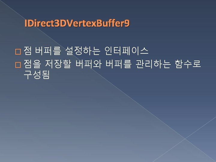 IDirect 3 DDevice: : Create. Vertex. Buffer() � HRESULT Create. Vertex. Buffer( UINT Length, DWORD Usage, DWORD FVF, D 3 DPOOL Pool, IDirect 3 DVertex. Buffer 9** pp. Vertex. Buffer, HANDLE* p. Shared. Handle ); › Length : 점 버퍼를 생성할 메모리 크기 �FVF * 생성할 점의 개수 › Usage : Create. Device의 Behavior. Flags와 동일하 게 구성 › FVF : 점의 구조를 설정 › Pool : 점 버퍼의 메모리 위치를 지정 (D 3 DPOOL_DEFALUT) › pp. Vertex. Buffer : 점 버퍼의 메모리 주소