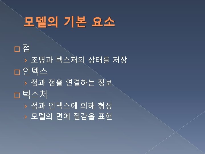 IDirect 3 DDevice: : Create. Index. Buffer() � HRESULT Create. Index. Buffer( UINT Length, DWORD Usage, D 3 DFORMAT Format, D 3 DPOOL Pool, IDirect 3 DIndex. Buffer 9** pp. Index. Buffer, HANDLE* p. Shared. Handle ); › Create. Vertex. Buffer와 유사함 › Length : 점 개수 * 인덱스 사이즈 › Format : 인덱스 버터의 형식