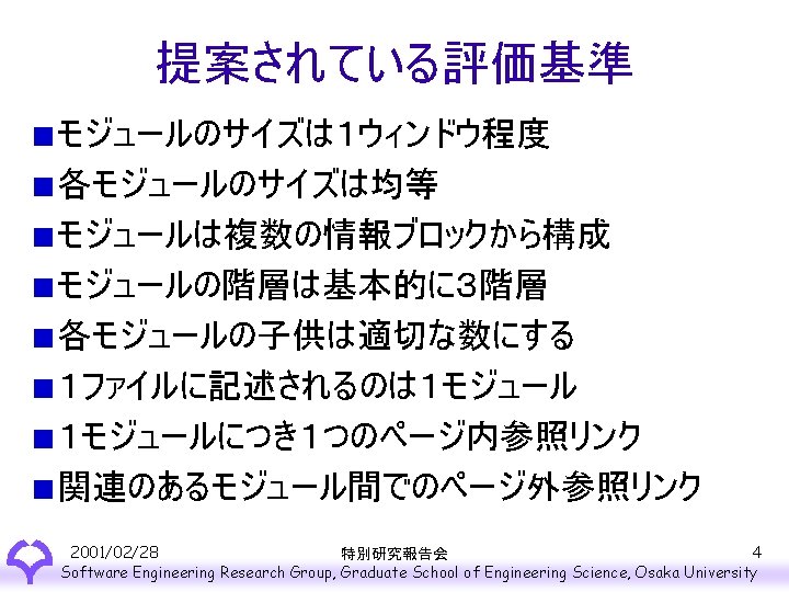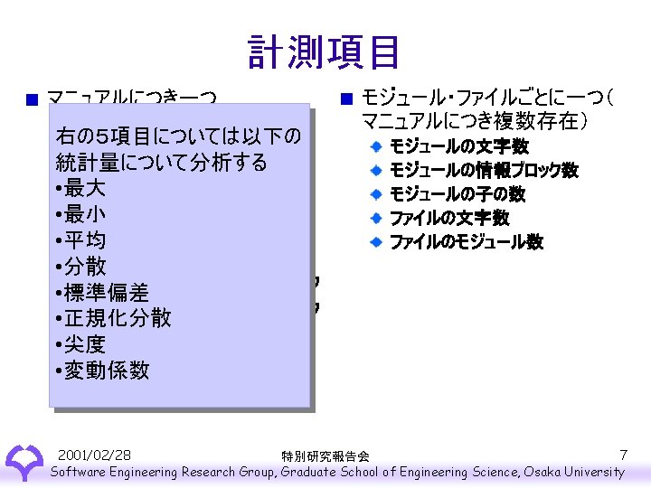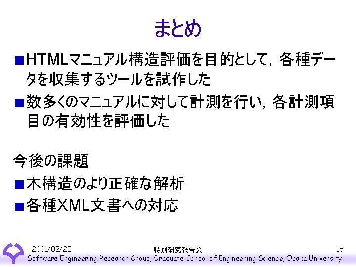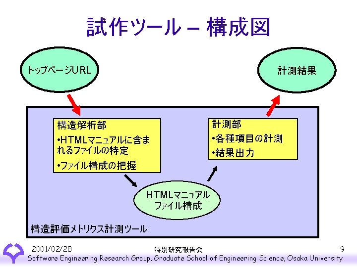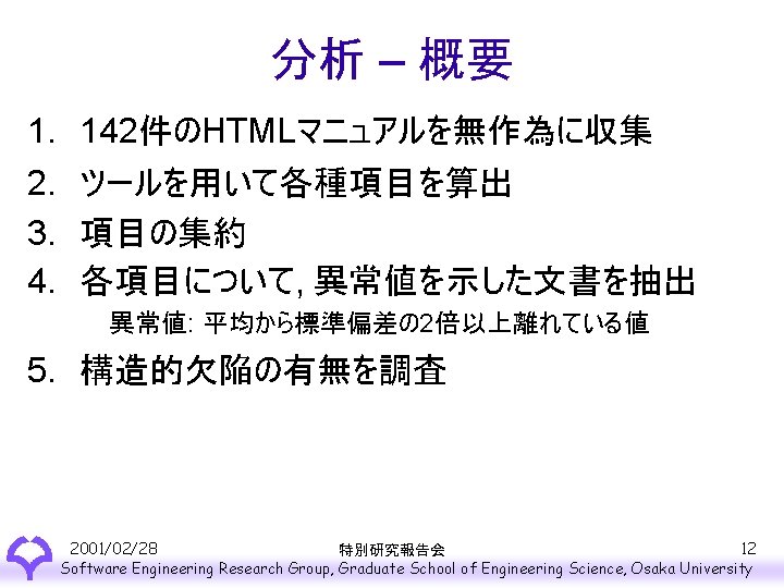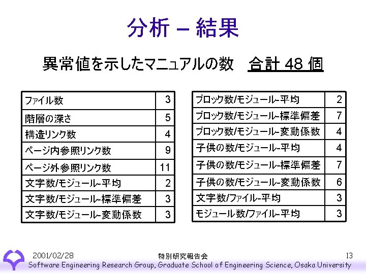 試作ツール – 出力例 マニュアル ごとに 1つだけ 存在 マニュアル ごとに 複数 存在 ~/JIKKEN/www. iph. pref. hyogo. jp/users/info/dokugeki/kensahou. htm the number of file = 11 tree depth = 3 structure link = 1. 33067198935462 inside link = 0. 332667997338656 reference link = 3. 2435129740519 odd file of structure link = 1 odd file of inside link = 0 odd file of reference link = 1 avg. (中略) sd. cv module size 1. 9 e+02 1 module block 0. 76 1. 5 2 module child count 5 7 1. 4 file size 1. 1 e+03 5. 1 e+02 0. 46 module count per file 5. 7 3. 9 0. 68 2001/02/28 11 特別研究報告会 Software Engineering Research Group, Graduate School of Engineering Science, Osaka University