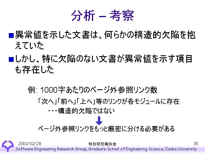 分析 – 結果の一例 「SCM - Scheme Implementation」 SCM(Scheme言語の処理系) マニュアル http: //www. melt. kyutech. ac. jp/~melt/Seminars/Simply. Scheme/scm. html 異常値項目 「1000字あたりのページ内参照リンク数」 8. 02 (平均1. 5467) 「ファイル文字数: 平均」 185366 (平均13508) 単一の巨大なファイル(360 KB)で構成されている 分割が必要 2001/02/28 14 特別研究報告会 Software Engineering Research Group, Graduate School of Engineering Science, Osaka University