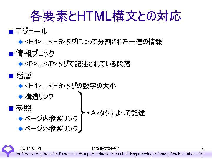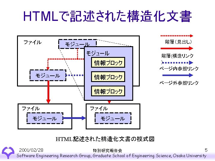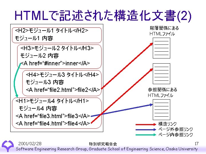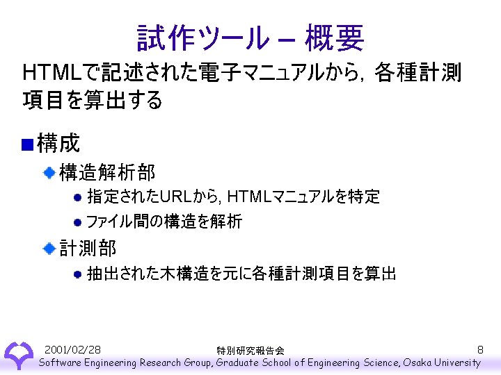 試作ツール – ファイル構造解析 トップページ 構造リンク ページ外参照リンク 1 2 5 3 6 7 4 8 2001/02/28 10 特別研究報告会 Software Engineering Research Group, Graduate School of Engineering Science, Osaka University