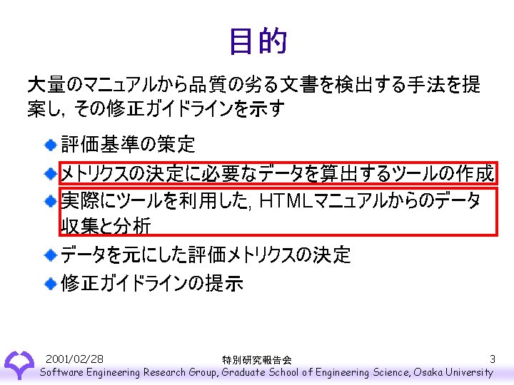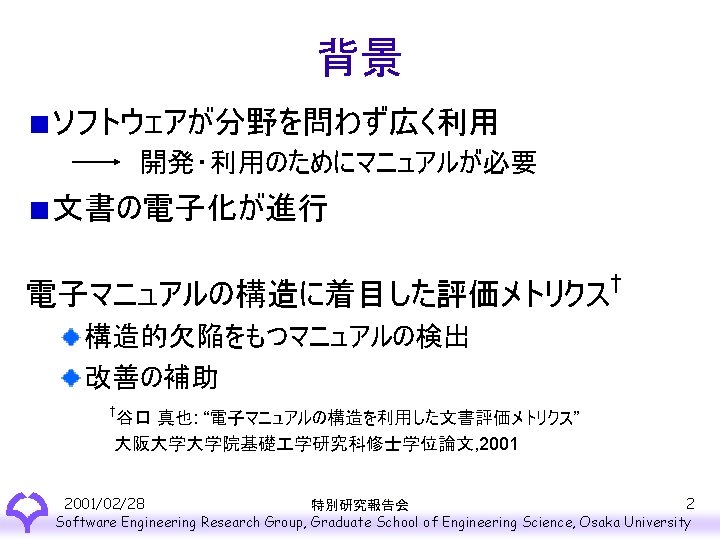 文書構造を利用した 電子マニュアル評価メトリクス 計測ツールの試作 井上研究室 川口 真司 2001/02/28 特別研究報告会 Software Engineering Research Group, Graduate School of Engineering Science, Osaka University