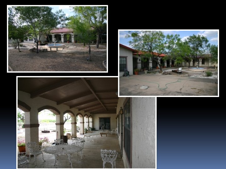 The 4, 200 sq. ft. , 6 bedroom, 5 bath hacienda at the Caiman Ranch HQ is of a Spanish style with deep porches, a walled large courtyard surrounding the main house, complete with a fountain. The hacienda is built on a concrete slab, with a stucco exterior, saltillo tile floors, mostly 9 foot ceilings, and ceiling fans through out.
