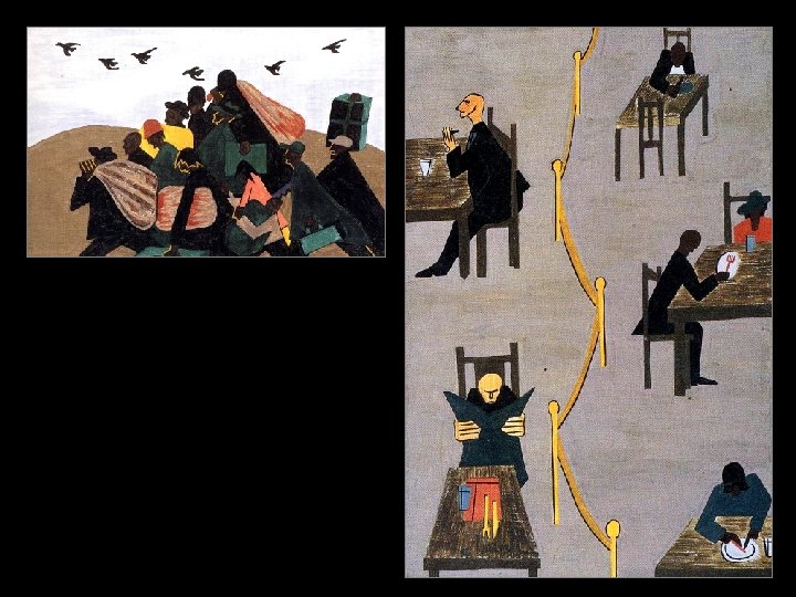 Essay Question 5: The American artist Jacob Lawrence painted the two works shown. Discuss the historical and social themes in his work. How does the artist use formal elements to construct narrative? (10 minutes)