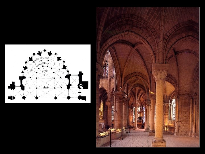 The apse of the building Suger is describing is shown in this plan and interior view. What new architectural style does the building introduce? Referring to both the plan and the interior view, explain how the apse reflects Suger’s description. (10 minutes)