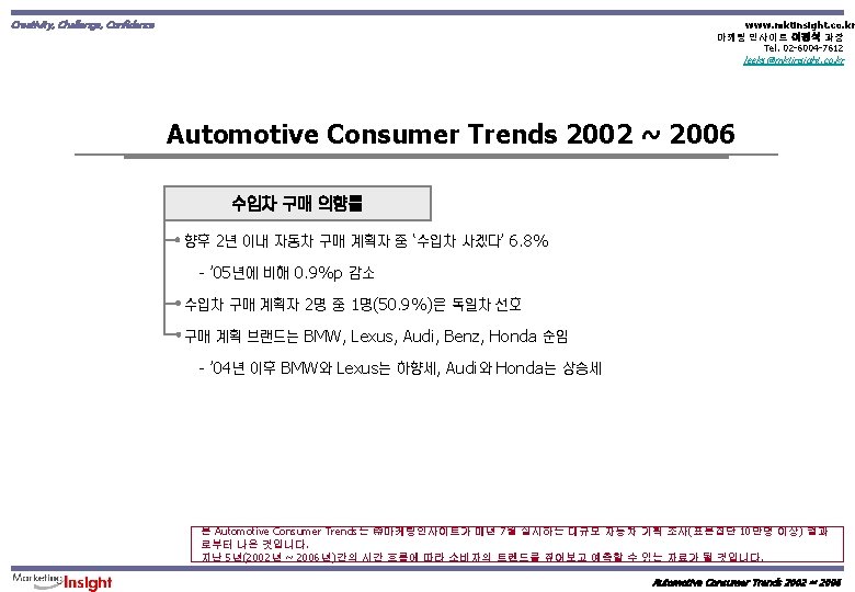 20022006 Figure 1 Import Domestic Luxury 2 nd2002 Slides: 4 Download presentation ¡ 구매 의향률 추이(2002~2006) [ Figure 1. 구매 의향률 추이 ] (%) Import Domestic Luxury 2 nd(2002) 3 rd(2003) 4 th(2004) 5 th(2005) 6 th(2006) Wave(Yr) * 조사대상 : 해당 차수별 향후 2년 이내 자동차 구매계획자 (ex. 6차 조사의 경우 2008년 6월 이내 새차 구매계획자) ** 6차 조사 국산 대형차 : Equus, Opirus, Chairman (편의상 Statesman 포함) -1 - Automotive Consumer Trends 2002 ~ 2006