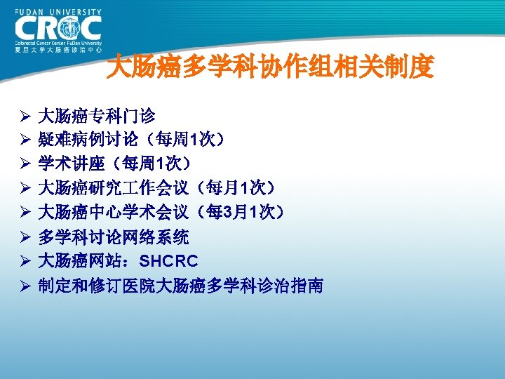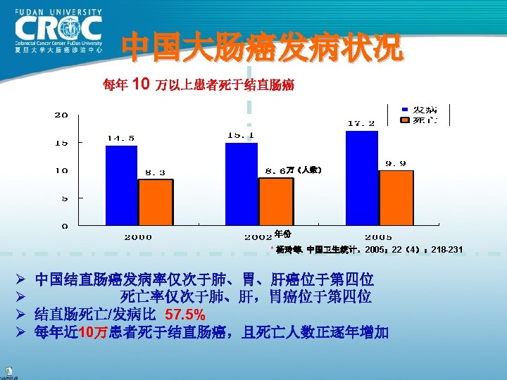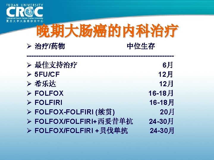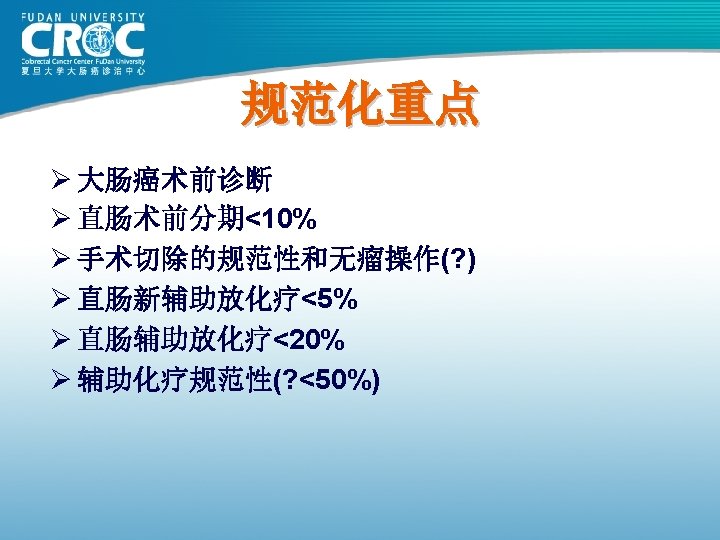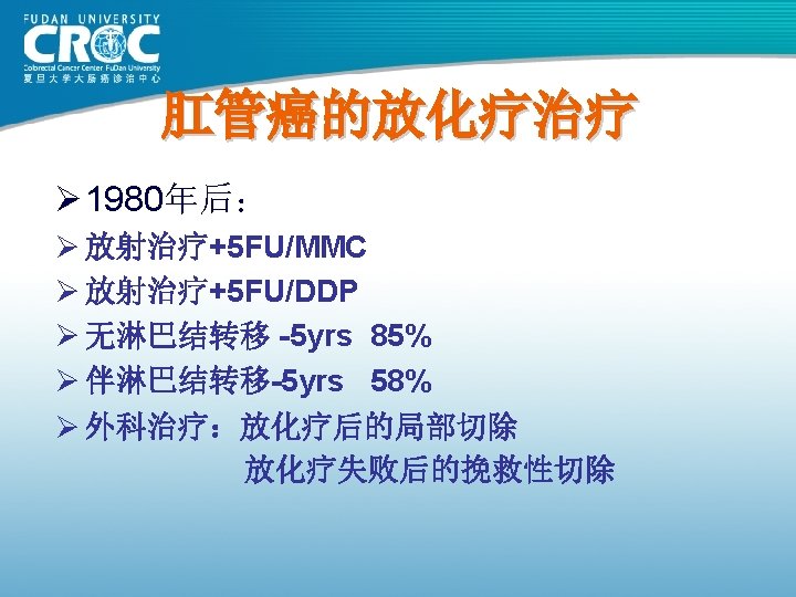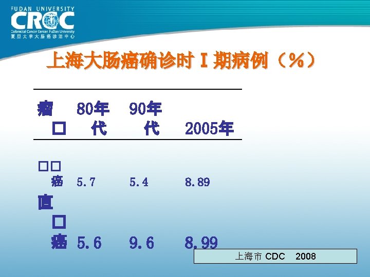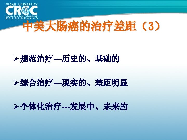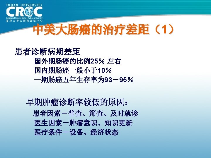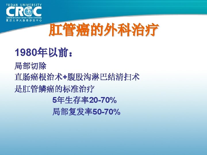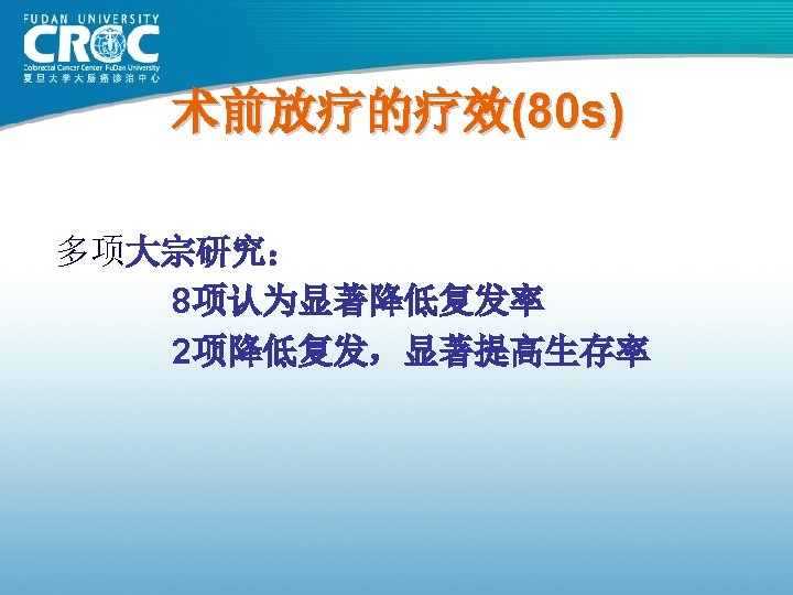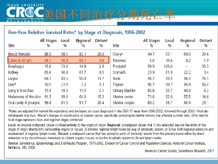 80年代结肠癌手术疗效 Monash MSKCC 杭州肿瘤 上海瑞金 上海肿瘤 例数 (年份) 615( 1980) 703( 1980) 123( 1982) 302( 1983) 261( 1985) Dukes’A 88 69. 25 62. 09 100 93. 25 Dukes’B 78 69. 25 62. 09 74. 74 82. 70 Dukes’C 60 52. 19 38. 92 C 1: 45. 18 C 2: 28. 44 73. 62 75. 9 61. 82 72. 79 83. 84 5年生存率 76 (%)