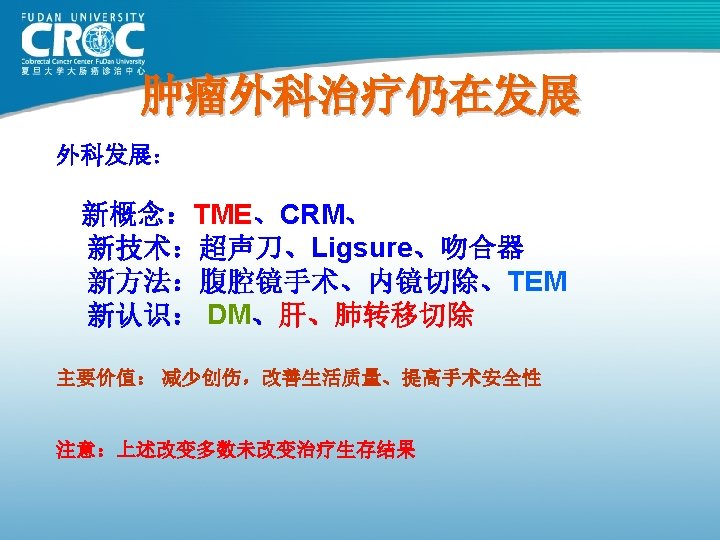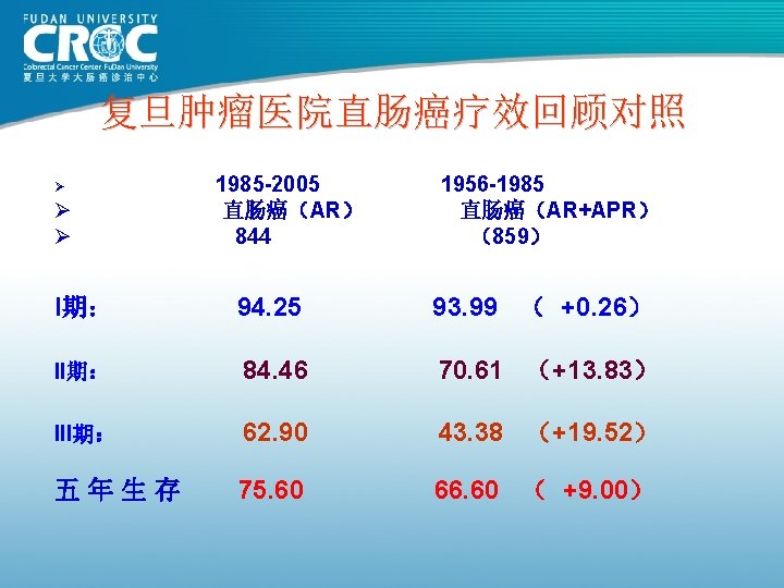 80年代直肠癌手术疗效 St. Mark’s MSKCC Monash 上海瑞金 上海肿瘤 例数 (年份) 1370( 1984) 495( 1980) 1061( 1980) 619( 1983) 859( 1985) Dukes’A 85. 6 77 88 98. 05 93. 99 Dukes’B 67. 5 77 76 68. 43 70. 61 Dukes’C 41. 3 41 41 C 1: 39. 66 C 2: 10. 21 43. 38 63 69 66. 91 66. 6 5年生存率 (%)