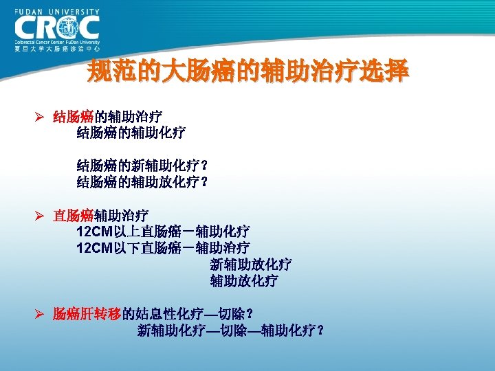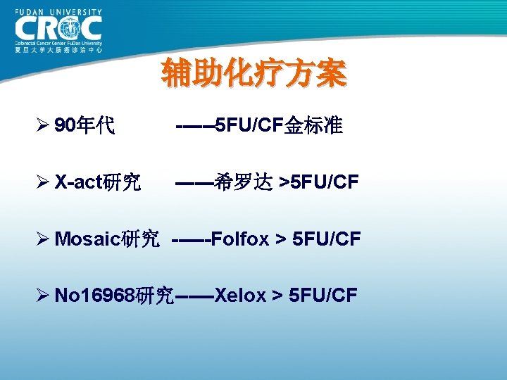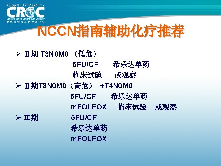 II期患者辅助治疗:反对意见 Ø INT-00351 Ø IMPACT B 22 Ø ASCO meta-analysis 3 1. Moertel CG et al. J Clin Oncol 1995; 13: 2936– 43 2. IMPACT B 2 Investigators. J Clin Oncol 1999; 17: 1356– 63 3. Benson et al. J Clin Oncol 2004; 22: 3408– 19