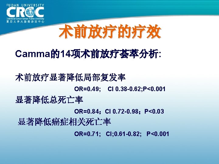CAO/ARO/AIO 94 (德国研究) 5 -Y preop(%) postop(%) P complete RT 92 54 <0. 001 Complete CT 89 50 <0. 001 3 -4 acute toxicity 27 40 0. 001 3 -4 late toxicity 14 24 0. 01 p. CR 8 0 <0. 001 SP 39 19 0. 004 LF 6 13 0. 006 DM 36 38 0. 84 DFS 65 68 0. 80 OS 74 76 0. 32