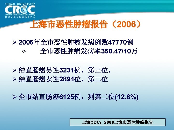 上海市大肠癌生存分析 市区 一年 885 68. 25 观察生存率% 二年 三年 四年 57. 40 49. 38 45. 31 五年 42. 03 中位生存期 天 月 1067 36 郊区 602 67. 11 54. 98 50. 00 45. 85 43. 02 1095 37 56. 42 55. 48 60. 10 57. 40 62. 28 60. 34 61. 39 65. 97 64. 49 65. 26 49. 63 48. 10 53. 63 50. 40 52. 97 51. 50 52. 29 58. 94 58. 16 58. 56 45. 53 43. 48 50. 24 46. 30 47. 51 47. 56 47. 53 52. 66 53. 06 52. 85 42. 43 40. 60 47. 98 43. 67 43. 50 43. 98 43. 72 50. 00 50. 61 50. 30 1075 1001 1499 1131 1294 1234 1271 1825 - 36 33 50 38 43 41 42 61 - 瘤别 性别 地区 结肠癌 男性 女性 直肠癌 男性 女性 2002 全市 市区 郊区 全市 病例数 1487 867 619 1486 623 532 1155 526 490 1016 67. 79 67. 94 71. 24 69. 31 74. 16 74. 44 74. 29 77. 19 76. 33 76. 77 上海CDC 2008