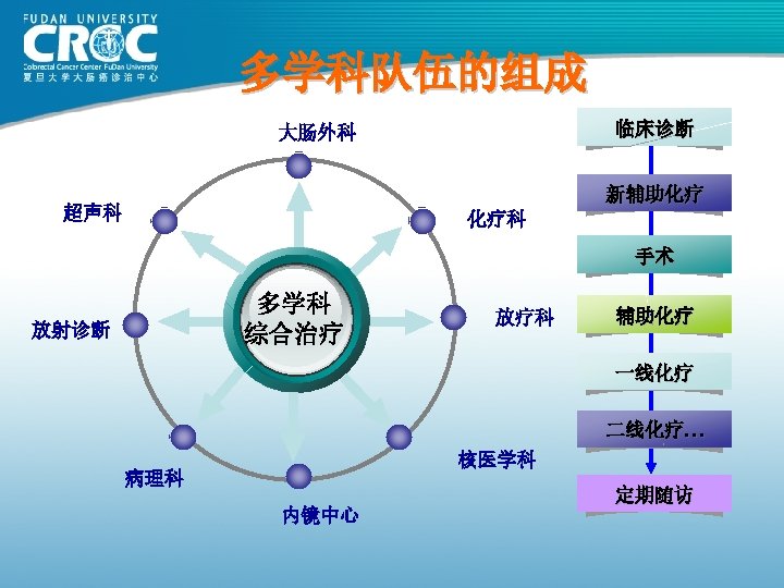英国恶性肿瘤处理 The Law says 2007 Ø All patients with possible cancer MUST be seen by a specialist within 2 weeks of presentation to their family doctor (General Practitioner) Ø All diagnostic investigations MUST be completed with 4 weeks Ø All patients with a confirmed diagnosis of cancer MUST be discussed by the appropriate Multi-Disciplinary Team before treatment commences Ø Treatment MUST commence within 31 days of the confirmed diagnosis of cancer