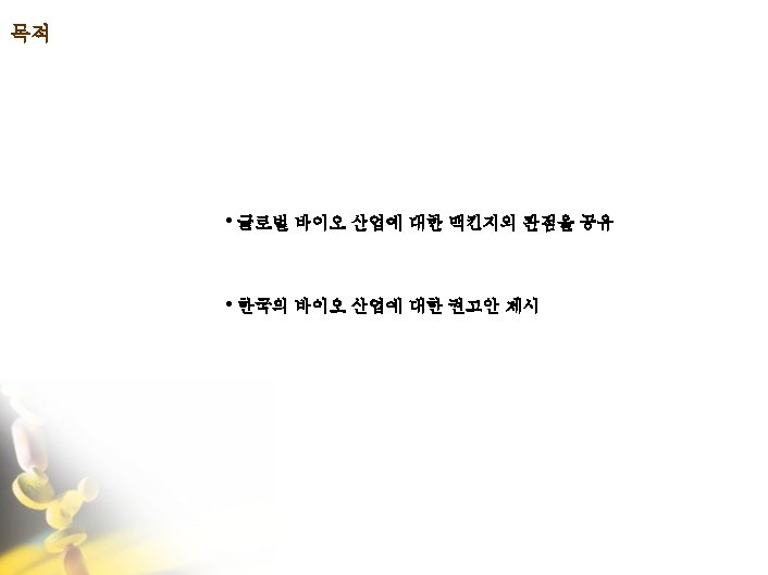 한국의 바이오 산업: 잠재력과 향후 과제 전경련 발표 자료 2004년 3월 16일 This report is solely for the use of client personnel. No part of it may be circulated, quoted, or reproduced for distribution outside the client organization without prior written approval from Mc. Kinsey & Company. This material was used by Mc. Kinsey & Company during an oral presentation; it is not a complete record of the discussion.