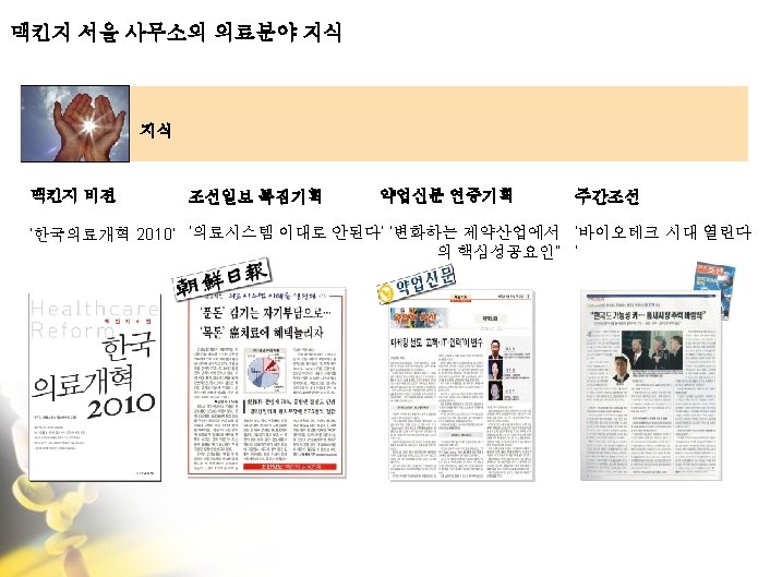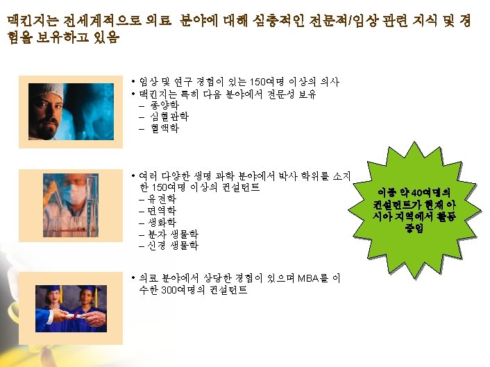 맥킨지는 경영 컨설팅사로서 광범위한 글로벌 네트워크를 보유하고 있음 맥킨지는 44개국에서 85개의 사무소를 운영하며 전세계를 커버하고 있음 17개의 글로벌 산업 부문에서 경험을 축적 하였음 유럽/중동/아프리카 (37) 북미 (23) Atlanta Austin Boston Charlotte Chicago Cleveland Dallas Detroit Houston Los Angeles Miami Minneapolis Montreal New Jersey New York Orange County Pittsburgh San Francisco Seattle Silicon Valley Stamford Toronto Washington, DC 중남미 (8) Bogotá Buenos Aires Caracas Mexico city Monterrey Rio de Janeiro Santiago Sao Paulo Abu Dhabi Amsterdam Antwerp Athens Barcelona Berlin Brussels Budapest Cologne Copenhagen Dubai Dublin Dusseldorf Frankfurt Geneva Gothenburg Hamburg Helsinki Istanbul Johannesburg Lisbon London Madrid Milan Moscow Munich Oslo Paris Prague Rome Stockholm Stuttgart Tel Aviv Verona Vienna Warsaw Zurich 전세계에서 약 6천명의 컨설턴트가 활동중 • 우주항공 및 방위산업 • 자동차 및 조립업 아시아 (17) Auckland Bangkok Beijing Delhi Hong Kong Jakarta Kuala Lumpur Manila Melbourne Mumbai Osaka Seoul Shanghai Singapore Sydney Taipei Tokyo • • • • – 자동차 OEM 업체 및 공급업체 – 자동차를 제외한 운송수단 제조업체 은행 및 증권업 화학 소비재/포장재 전력/천연 가스 의료 보건업 – 의약품, 바이오 및 의료 기기 – 의료 보험사 및 의료 서비스 제공기관 첨단 기술 보험 미디어 및 엔터테인먼트 금속 및 광물업 석유 제지 소매 판매 통신 교통