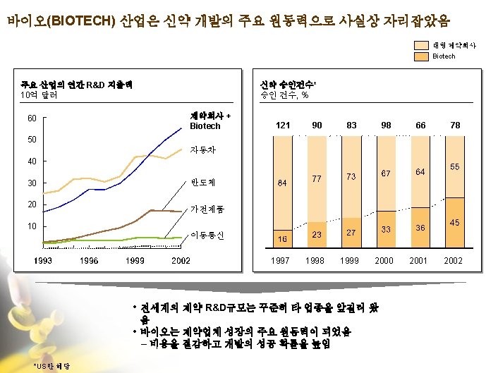 글로벌 시장에서 기존 경쟁사들에 대응하기 위해서는 대규모 투자가 점차 요구되 고 있음 순위 상장된 바이오 기업(미국) 1 Amgen 2 2002년 R&D 지출 백만 달러 종업원 수 1, 117 10, 100 Genentech 624 6, 226 4 Millenium Pharmaceuticals 511 2, 079 5 Celera Genomics 483 540 7 Biogen IDEC 464 995 8 Chiron 326 5, 332 12 Human Genome Sciences 191 1, 086 21 Abgenix 129 387 97 Invitrogen 34 2, 995 99 Sequenom 34 216 -- 한국의 평균 바이오 기업 5 -50 50 -500 동등한 경쟁을 위 해 최소한의 투자 및 인력 필요