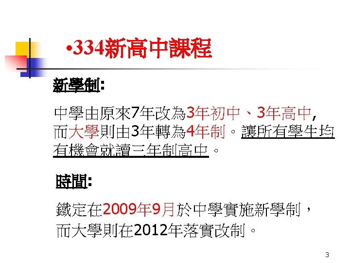 新高中課程必修科 (2009) Level Chinese Language Education Chinese Language 中國語文教育 S 4 - 6 Core Subjects (2009) English Language Education Mathematics Education English Language Mathematics (compulsory part) 英國語文教育 數學教育 新高中課程政府擬定之選修科 (2009) NSS Electives (excluding Applied Learning) (2009) Chinese Literature and English Literature 中國文學及英 語文學教育 Science Education 科學教育 Technology Education 科技教育 Biology 生物 Business, Accounting and Financial Studies 企業、會計與財 務概論 Chinese History 中國 歷史 Physical Education 體育 Chinese Literature 中國文學 Chemistry 化學 Design and Applied Technology 設計 與應用科技 Economics 經濟 Music 音樂 English Literature 英語文學 Physics 物理 Health Management and Social Care 健康管理與社會 關懷 Ethics & Religious Studies 倫理與宗教 Visual Arts 視覺藝術 Science (Combined Mode) 組合科學 Information and Communication Technology 資訊 與通訊科技 Science (Integrated) 綜合科學 Technology and Living (formerly named as Home Economics) 科技與生活 History 歷史 Tourism and Hospitality Studies 旅遊與款待 註: Liberal Studies 通識教育 Physical Education, Music and Visual Arts Education 體育, 音樂及 藝術教育 Personal, Social and Humanities Education 個人、社會 及人文教育 Geography 地理 紅色字體者乃本校 擬定 開設之選修科 8